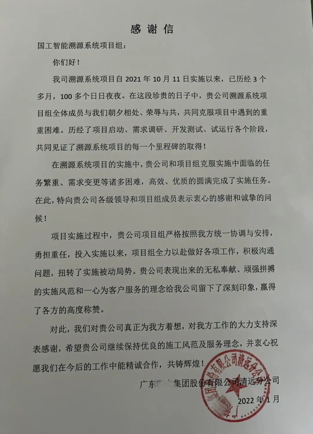 近期,國工智能收到了一封來自廣東某千億級上市公司熱情洋溢的感謝信,主要對公司各級領導及溯源系統項目組成員的全力支持和協助表示感謝,對他們勤奮敬業、踏實務實的工作精神,無私奉獻、頑強拼搏的實施風范和一心為客戶服務的理念表示真心的感謝,并表示愿與國工智能在今后的智能化改造工作中可以精誠合作,共鑄輝煌!