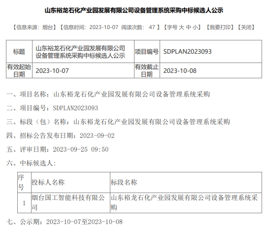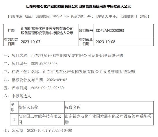 金秋10月,奮勇爭先,中標喜報,乘“豐”而來!國工智能以豐富的行業經驗、雄厚的技術力量和良好的企業信譽,通過層層篩選、激烈角逐,成功中標了山東裕龍石化產業園發展有限公司的多個項目:生產管理系統(MES)和設備管理系統。