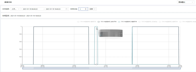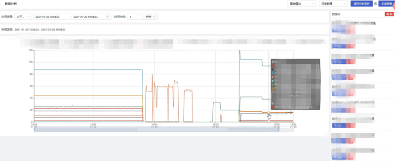 根據(jù)用戶的需要,對一段時間內(nèi)的歷史數(shù)據(jù)或?qū)崟r數(shù)據(jù)按照一定的統(tǒng)計頻率進行多個維度的數(shù)據(jù)分析,統(tǒng)計頻率包含不限、10秒、30秒、10分鐘、30分鐘、1小時,通過添加變量操作,在彈出的變量選擇彈窗中可多選數(shù)據(jù)點信息進行分析;數(shù)據(jù)分析得到的圖表顯示形式包括折線圖以及表格形式。多個數(shù)據(jù)點信息圖表的展示形式包括平鋪、疊加、標簽顯示以及合并表格顯示,根據(jù)不同的需求選擇對應(yīng)的展示形式,靈活性高。數(shù)據(jù)分析幫助用戶分析用戶想要分析的內(nèi)容,如數(shù)據(jù)走向,問題等,可以將分析的邏輯進行保存并可以按部門和人員進行公開,從而幫助用戶解決問題。(可參考圖1.1)