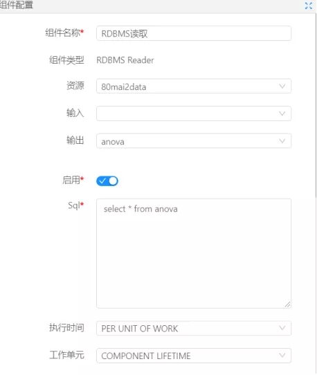 首先,我們需要在數(shù)據(jù)大腦系統(tǒng)中進(jìn)行流程的搭建,思路是從數(shù)據(jù)庫中讀取數(shù)據(jù)后,將數(shù)據(jù)投入到單因素方差分析組件中,然后對算法運行所需要配置的參數(shù)進(jìn)行配置,下圖是對數(shù)據(jù)庫讀取組件的配置: