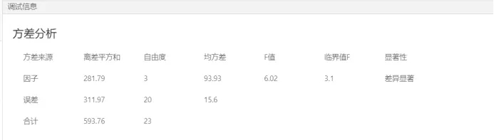 我們可以得到的結(jié)論是油漆混料的硬度明顯不同。據(jù)此得出的結(jié)論是油漆的配方對油漆混料后的硬度有顯著影響,因為單因素方差分析只針對一個因素,所以得出的結(jié)果有限,等我們拿到這個數(shù)據(jù)之后可以在數(shù)據(jù)大腦平臺中進(jìn)行更進(jìn)一步的分析,從而可以分析配方的具體哪幾種因素對硬度影響較大。