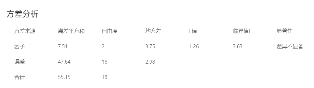 因此在0.05的顯著性水平下可以得出,F=1.26小于臨界值F=3.63,即三種催化劑催化活性無(wú)顯著性差異。