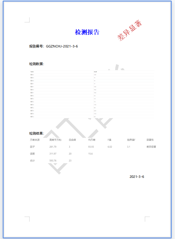 國(guó)工數(shù)據(jù)大腦平臺(tái)可直接獲取實(shí)驗(yàn)室LIMS系統(tǒng)中的實(shí)驗(yàn)數(shù)據(jù),直接將實(shí)驗(yàn)數(shù)據(jù)對(duì)接到創(chuàng)建好的單因素方差分析模型中,根據(jù)得出的分析結(jié)果自動(dòng)對(duì)報(bào)告進(jìn)行判定,代替人工判定;并將存在顯著性差異的報(bào)告重點(diǎn)推送給相關(guān)領(lǐng)導(dǎo)引起重視。根據(jù)領(lǐng)導(dǎo)對(duì)存在顯著性差異報(bào)告的處理,可自動(dòng)觸發(fā)二次檢驗(yàn)流程等操作。