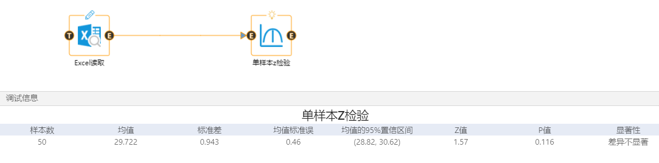 使用集成好算法的單樣本 Z 檢驗組件進行數(shù)據(jù)的分析處理,對組件參數(shù)進行設(shè)置,假設(shè)均值為29,已知標準差為3.25,顯著性水平設(shè)置為0.05,單擊運行,從調(diào)試面板中查看分析結(jié)果。