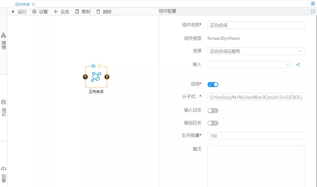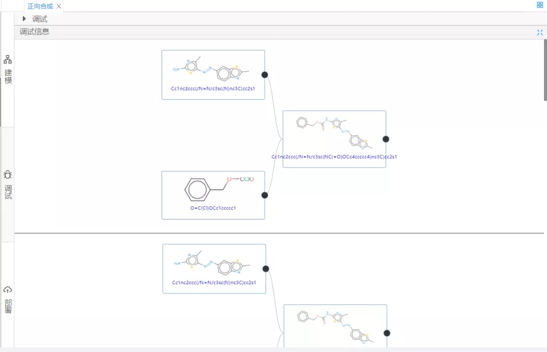然后,進(jìn)行組件配置。資源項(xiàng)選擇正向合成云服務(wù),分子式填入?yún)⑴c反應(yīng)的相關(guān)反應(yīng)的SMILES表達(dá)式,并按照相應(yīng)規(guī)則填入,如圖2所示。最后點(diǎn)擊調(diào)試,當(dāng)顯示運(yùn)行成功時(shí)即表示運(yùn)行預(yù)測算法成功,平臺(tái)會(huì)將預(yù)測結(jié)果展現(xiàn)給用戶,結(jié)果如圖3所示。