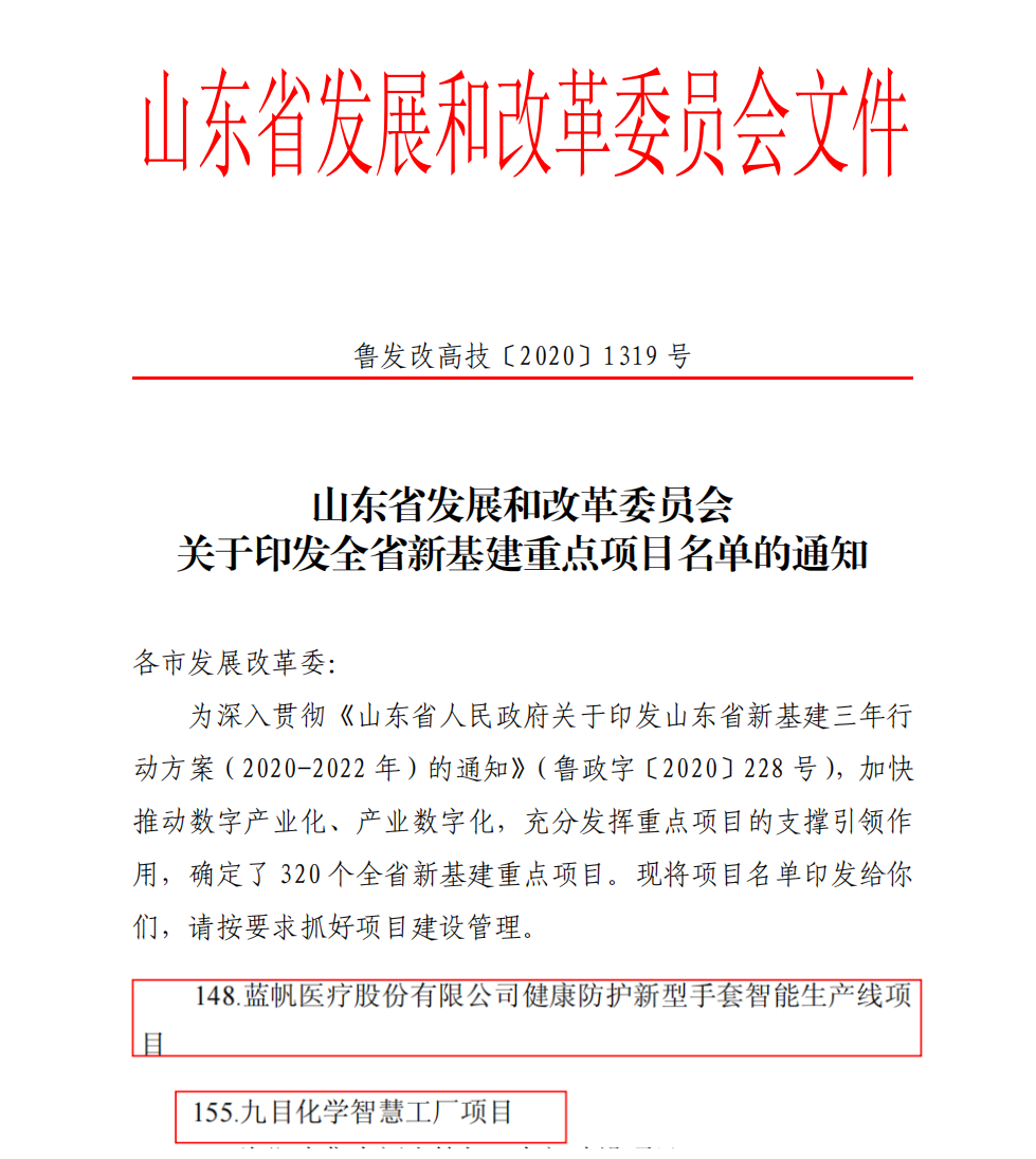 近日,山東省發(fā)展和改革委員會(huì)印發(fā)了全省新基建重點(diǎn)項(xiàng)目名單的通知,其中由國工智能負(fù)責(zé)承建的兩個(gè)智慧工廠項(xiàng)目被列為山東省新基建重點(diǎn)項(xiàng)目,分別是藍(lán)帆醫(yī)療股份有限公司健康防護(hù)新型手套智能生產(chǎn)線項(xiàng)目和九目化學(xué)智慧工廠項(xiàng)目。