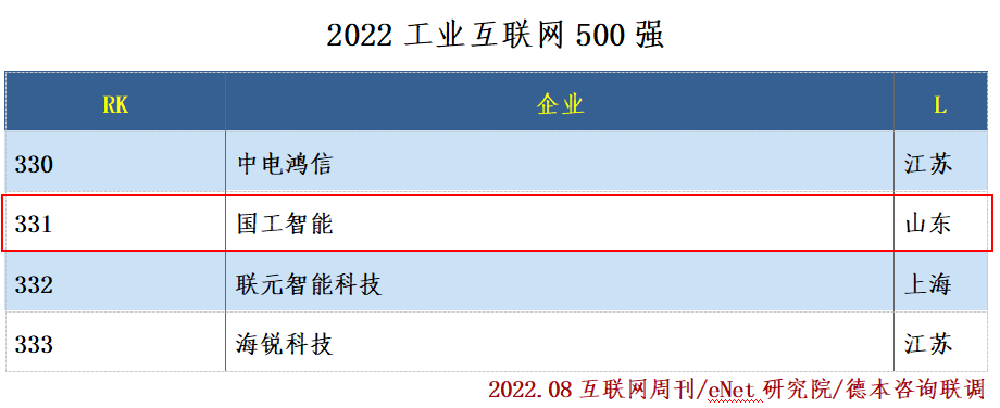 8月1日,中國《互聯網周刊》聯合eNET研究院、德本咨詢共同發布“2022工業互聯網500強”企業名單,國工智能位列第331位,這是入選中國工業軟件百強企業(第88位)后,再次入選國家級排名,是煙臺市、山東省僅兩家同時入選的工業軟件公司。