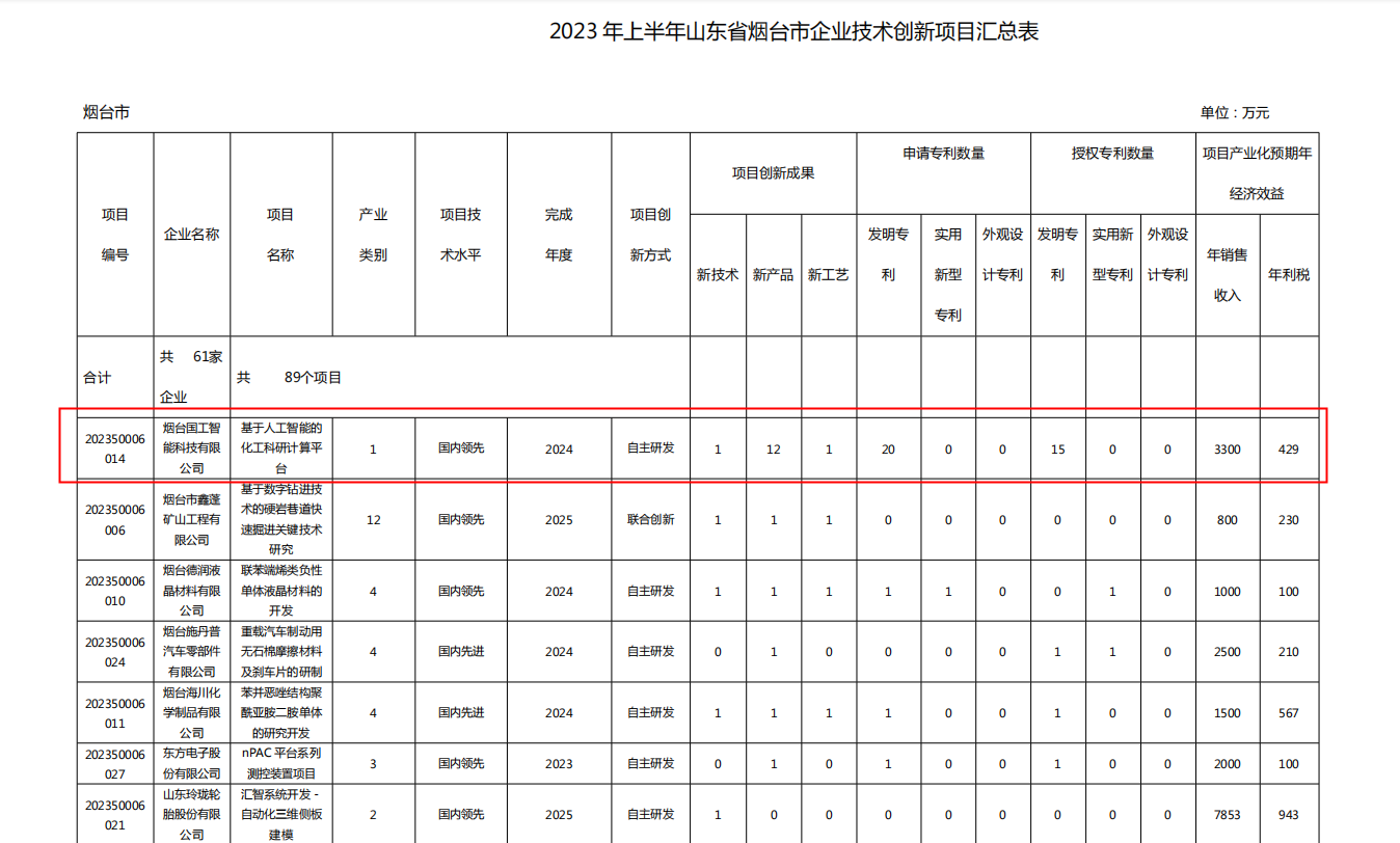5月29日,山東省工信廳發(fā)布《山東省工業(yè)和信息化廳關(guān)于印發(fā)2023年山東省第一批技術(shù)創(chuàng)新項(xiàng)目計(jì)劃的通知》,國工智能“基于人工智能的化工科研計(jì)算平臺(tái)”入選此次創(chuàng)新項(xiàng)目計(jì)劃。