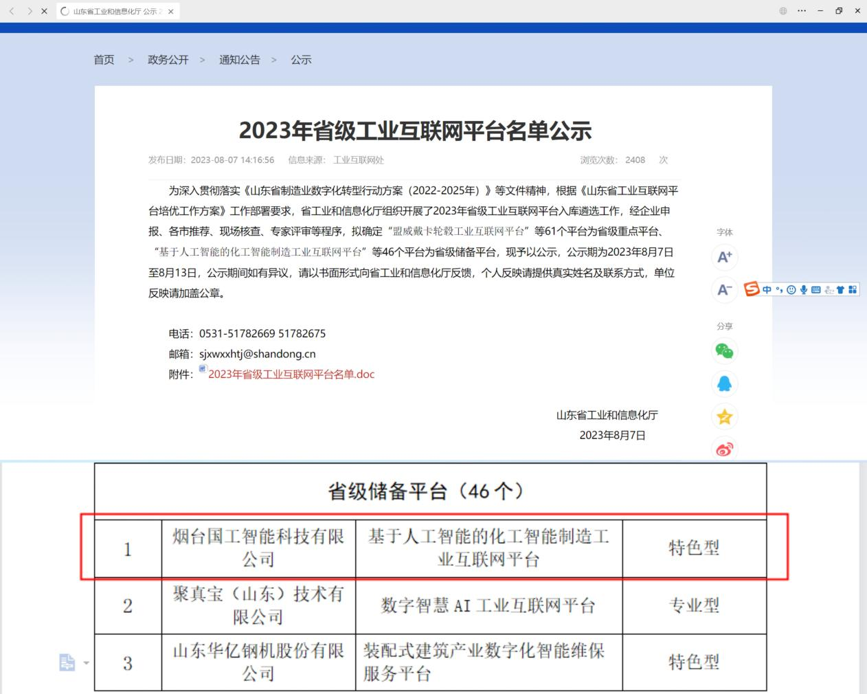 省工業和信息化廳組織開展了2023年省級工業互聯網平臺入庫遴選工作,經企業申報、各市推薦、現場核查、專家評審等程序,擬確定61個平臺為省級重點平臺、46個平臺為省級儲備平臺,國工智能“基于人工智能的化工智能制造工業互聯網平臺 ”入選為省級儲備平臺。